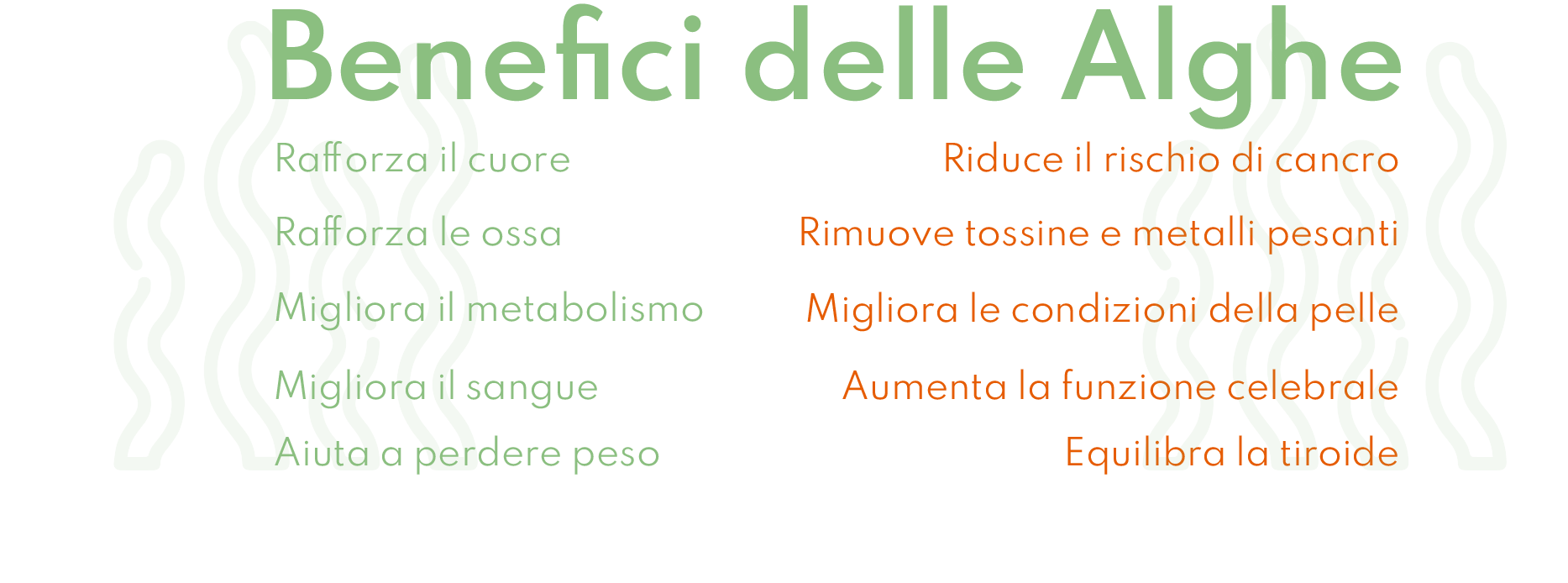 Le alghe contengono alti livelli di calcio, ferro, vitamine A, C e K, potassio, selenio e magnesio. Ancora più importante, è una delle migliori fonti naturali di iodio , un nutriente che manca alla maggior parte degli altri alimenti ed è anche essenziale per una ghiandola  tiroidea funzionante . Contiene anche alti livelli di vitamina B12, che è un’ottima notizia per vegetariani e vegani perché è una delle poche fonti vegetali di questo nutriente essenziale. L’alga è anche povera di grassi e ricca di fibre, il che la rende un ottimo aiuto per perdere peso.