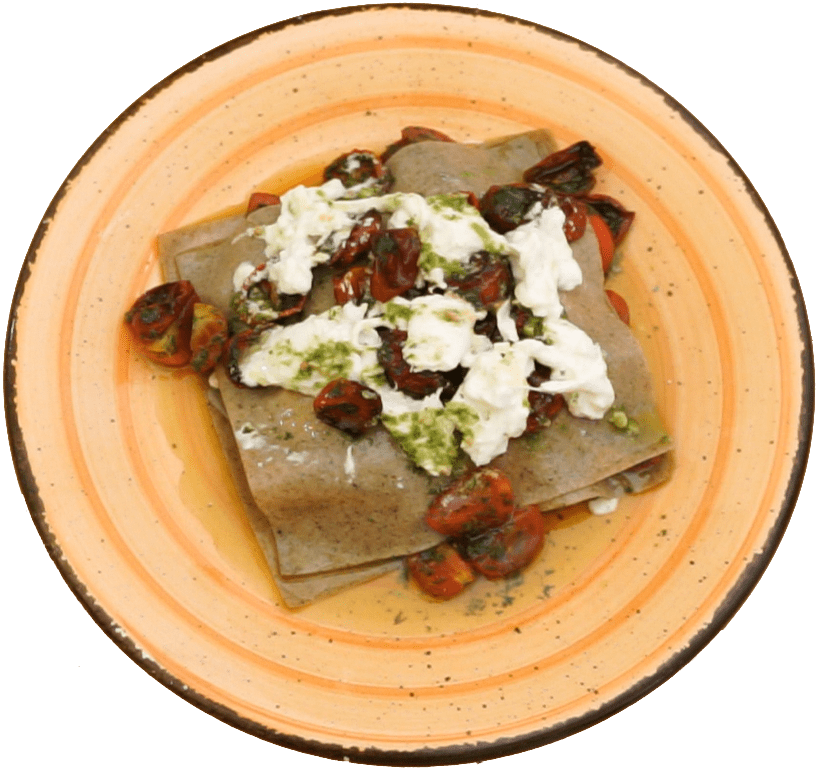 Lasagnetta fredda con pomodorini arrosto, burrata e pesto